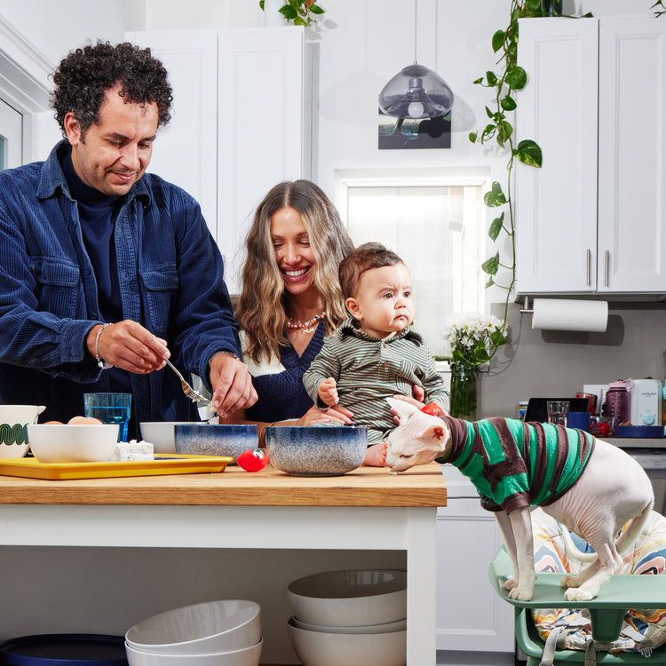 Great Ones is a celebration of humans we admire — and an exploration of why they cook, not just how. Comedic and creative forces combine with couple Kareem Rahma, of Subway Takes fame, and writer and artist Karina Muslimova. Kareem and Karina first connected over a shared appreciation of breakfast for dinner, so it was only fitting they whipped up breakfast bowls at home with the cutest sous-chef: their baby. We chatted with them about their kitchen takes, how to make perfect scrambled eggs, and why riffing and failing in the kitchen is a good thing.