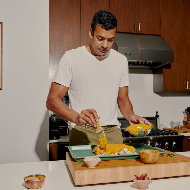 Great Ones is a celebration of humans we admire — and an exploration of why they cook, not just how. Basu Ratnam is the founder of INDAY, an Indian-inspired fast-casual restaurant group in New York City. In response to the devastating impact of COVID-19 in India, Basu also started 1 Billion Breaths, a global movement to raise funds for relief efforts. We partnered with Basu and 1 Billion Breaths to donate a portion of sales from The Whole Grain Family — the first Great Jones design made in India — to local aid organizations. Here, we joined him in his home in New York City to make a spin on a tandoori rotisserie chicken, using Small Fry and Holy Sheet.