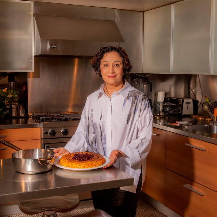 These days, many people are obsessed with something Persian called tahdig. It’s the crispy rice at the bottom of the pot. There are so many variations, but the one I made today is an iconic dish made with yogurt and saffron. Both of these items are very dear to me. First of all, I always make my own yogurt — all throughout my life. We make our yogurt at Sofreh, and there’s nothing like fresh yogurt. Saffron is the most precious spice in the world: 80 to 90% of saffron is produced in Iran. It’s my love for rice, yogurt, and saffron. Typically this rice is stuffed with chicken or lamb inside, but I wanted to mix things up. I made chicken with turmeric and saffron in Saucy. I loved using Saucy and Large Fry. Both are so easy to use. I usually cook with only stainless steel and have one nonstick for special occasions.